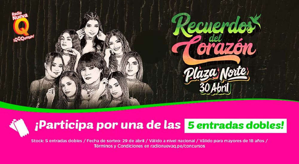 Cinco (5) entradas dobles para el concierto Recuerdos del Corazón a realizarse el 30 de abril del 2026 en Explanada Plaza Norte, independencia, desde las 08:00 p.m. (en adelante, el Evento). A razón de una entrada doble por ganador. Importante: - Radio Nueva Q no asumirá ningún gasto (sea por transporte, alojamiento, etc.) para el recojo ni disfrute del premio. - Los premios no son canjeables, reembolsables ni transferibles. - La producción y organización del Evento se encuentra a cargo en forma exclusiva y excluyente de G&N MUSIC S.A.C, con RUC Nº 20611018925. - Las entradas (premios) se rigen por los términos y condiciones de las mismas establecidas por el productor y organizador del Evento.