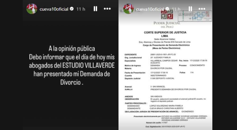 “A la opinión pública, debo informar que el día de hoy mis abogados del estudio Villaverde han presentado mi demanda de divorcio”, señaló Cueva en una de sus historias, confirmando así el inicio formal del trámite legal.