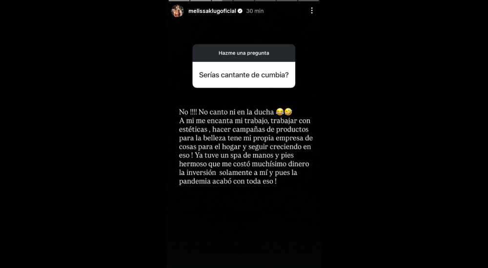 La empresaria Melissa Klug no dudó en responderle a sus seguidores a través de sus historias de Instagram. Con total sinceridad, la ‘Blanca de Chucuito’ reconoció que no tiene cualidades para el canto e incluso se animó a decir que no canta ni en la ducha.