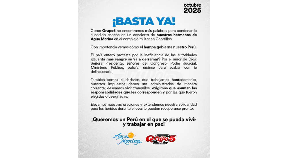 “Como Grupo 5 no encontramos más palabras para condenar lo sucedido anoche en un concierto de nuestros hermanos de Agua Marina en el complejo militar de Chorrillos”, fue lo primero que se leyó en el comunicado de Grupo 5.