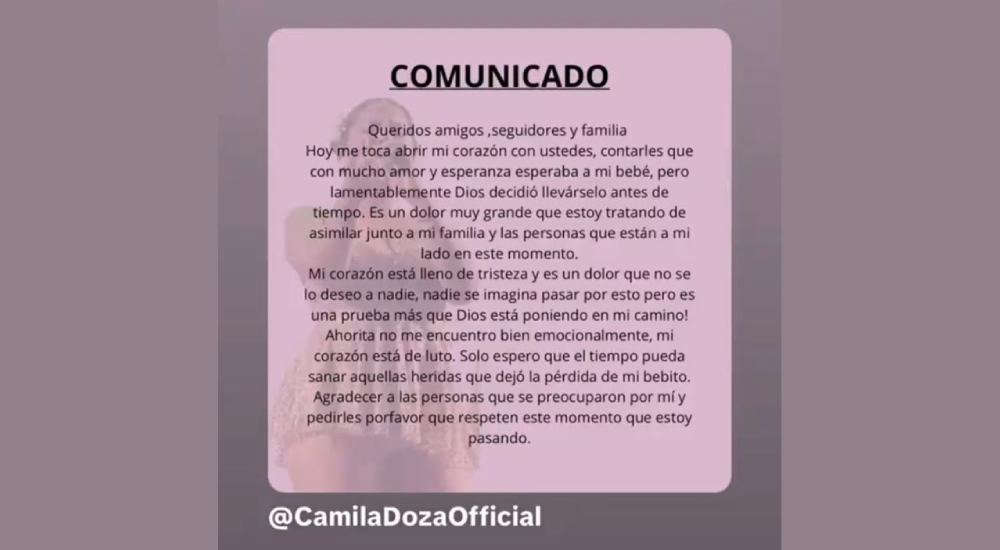 "Queridos amigos, seguidores y familia: hoy me toca abrir mi corazón con ustedes y contarles que, con mucho amor y esperanza, esperaba a mi bebé, pero lamentablemente Dios decidió llevárselo antes de tiempo", es parte del comunicado de Camila Doza, en donde confirma que perdió a su bebé.