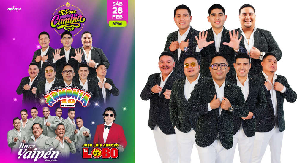 - Armonía 10 de Piura: "La universidad de la cumbia" llega con todo su arsenal de éxitos que han recorrido el Perú y el mundo. Es el gran regreso de la emblemática orquesta a San Juan de Lurigancho después de varios meses.