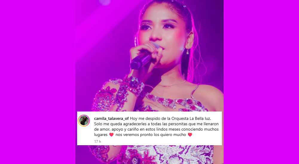 “Hoy me despido de la Orquesta La Bella Luz. Solo me queda agradecerles a todas las personitas que me llenaron de amor, apoyo y cariño en estos lindos meses conociendo muchos lugares ❤️ nos veremos pronto los quiero mucho”, comunicó Camila Talavera.