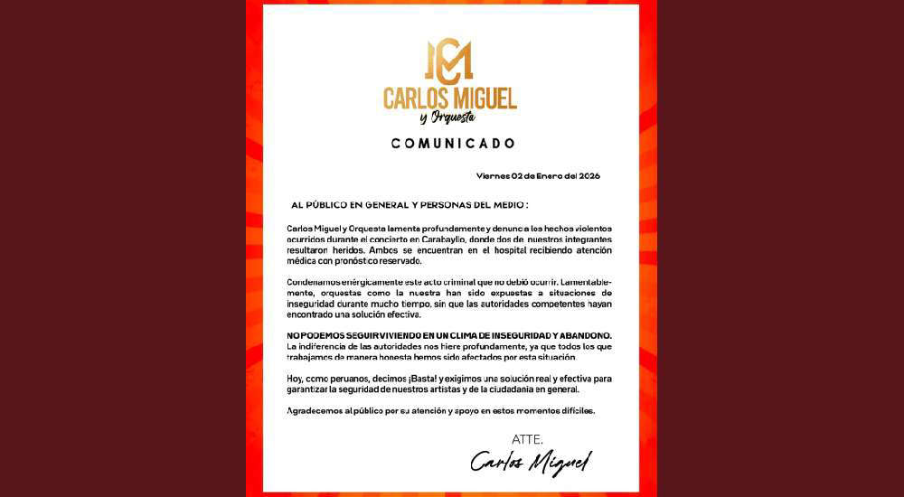 A través de un comunicado difundido en sus redes sociales, la agrupación expresó su preocupación por la inseguridad que afecta a los artistas en el país y lamentó lo sucedido durante el concierto. “Carlos Miguel y Orquesta lamenta profundamente y denuncia los hechos violentos ocurridos durante el concierto en Carabayllo, donde dos de nuestros integrantes resultaron heridos. Ambos se encuentran en el hospital recibiendo atención médica con pronóstico reservado”, indicaron.