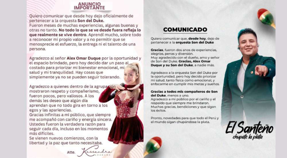La primera en pronunciarse a través de un comunicado fue la cantante Kassandra Chanamé. “Quiero comunicar que desde hoy dejo oficialmente de pertenecer a la orquesta Son del Duke. Fueron meses de muchas experiencias, algunas buenas y otras no tanto. No todo lo que se ve desde fuera refleja lo que realmente se vive dentro. Aprendí mucho, sobre todo a reconocer mi propio valor y a no permitir que se menosprecie el esfuerzo, la entrega ni el talento de una persona”, indicó.