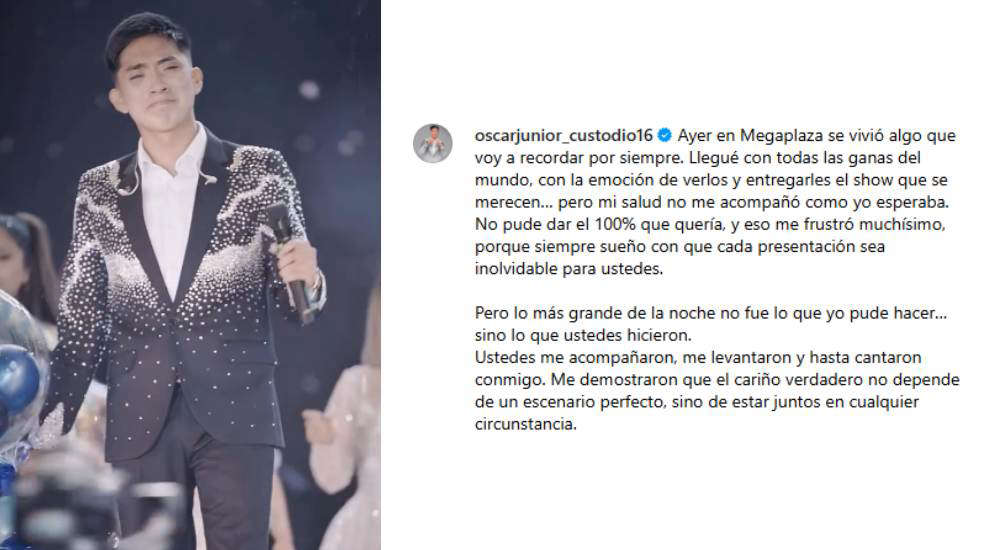 Oscar Junior Custodio, joven líder de La Bella Luz, compartió un emotivo mensaje tras su presentación en el Megaplaza de Independencia, donde no pudo rendir al máximo debido a su estado de salud. “Ayer en Megaplaza se vivió algo que voy a recordar por siempre. Llegué con todas las ganas del mundo, con la emoción de verlos y entregarles el show que se merecen… pero mi salud no me acompañó como yo esperaba”, expresó el joven cantante.