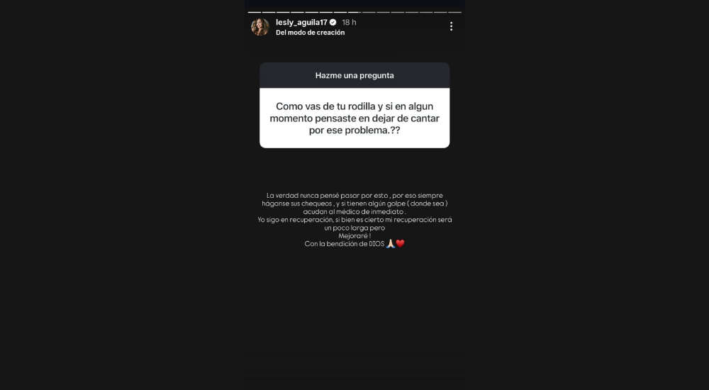 "La verdad nunca pensé pasar por esto, por eso siempre háganse sus chequeos, y si tienen un golpe (donde sea) acudan al médico de inmediato. Yo sigo en recuperación, si bien es cierto, mi recuperación será un poco larga, pero mejoraré con la ayuda de Dios", escribió Lesly Águila.