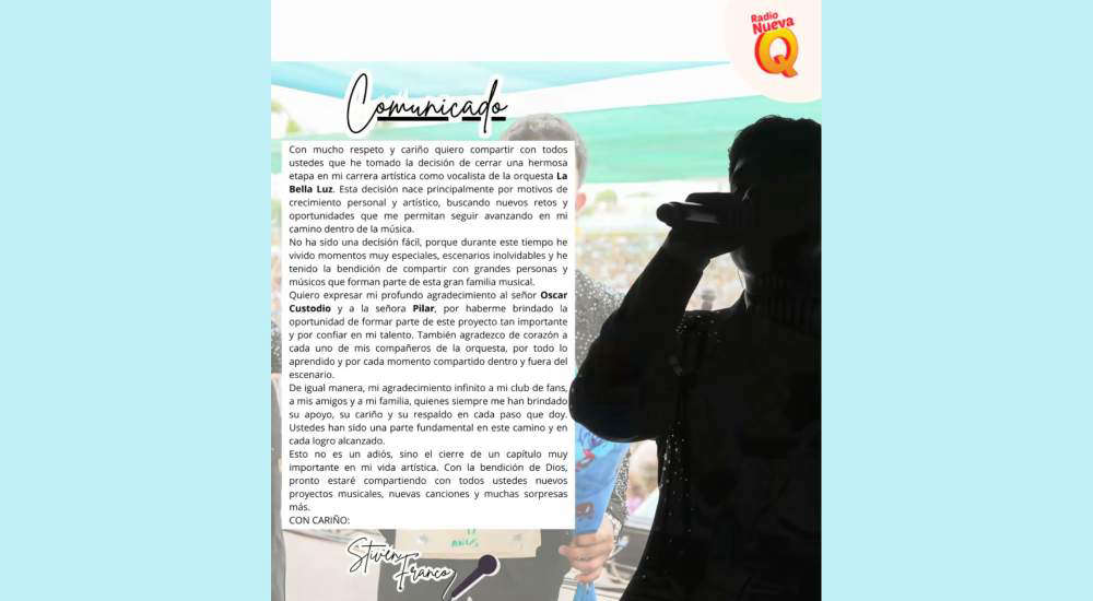 En su comunicado, Stiven Franco explicó que la decisión de ya no seguir en La Bella Luz responde a motivos personales y profesionales. “Con mucho respeto y cariño quiero compartir con todos ustedes que he tomado la decisión de cerrar una hermosa etapa en mi carrera artística como vocalista de la orquesta La Bella Luz”, expresó el cantante al inicio de su mensaje.
