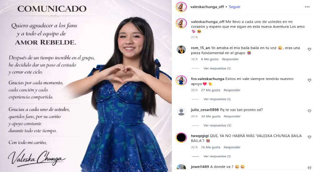 Mediante sus redes sociales, Valeska Chunga emitió un comunicado indicando que ya no forma parte Amor Rebelde. Además, agradeció el apoyo que recibió de sus seguidores y todo el equipo de la agrupación de cumbia.